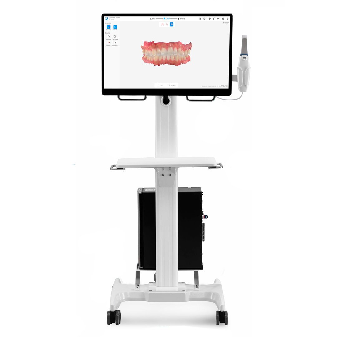El Kit de Escaneo Intraoral Runyes es una estación móvil «All-in-One» diseñada para eliminar la necesidad de conectar cables a computadoras portátiles externas o setups improvisados. Combina la potencia del escáner intraoral con un módulo de procesamiento (CPU integrada) y un monitor táctil de grado médico, todo montado sobre un carro ergonómico que permite llevar la odontología digital de un cubículo a otro con total facilidad.